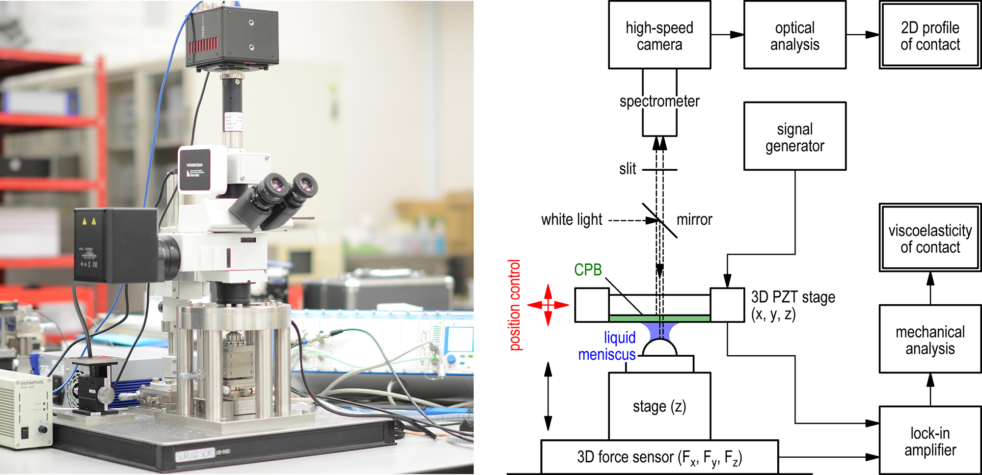 ポリマーブラシのマルチモーダル・オペランド計測:本研究室オリジナルの実験装置。ガラス基板に付与したポリマーブラシを対象として、超精密力学計測系と超薄膜光干渉分光計を組み合わせたマルチモーダル・オペランド計測を可能にする。本装置のポテンシャルを引き出す独自の実験プロトコルにより、ポリマーブラシの層構造と摩耗機構を突き止めた。(→論文を読む)