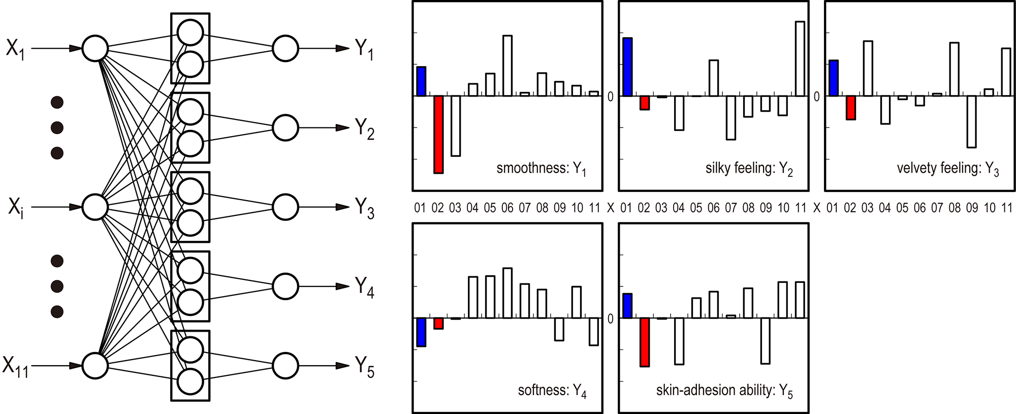 化粧品の塗布触感:肌に化粧品(リキッドファンデーション)を塗布する行動を模擬した摩擦試験を実施。獲得した時系列信号から11種類の特徴量(X1~X11)を抽出。化粧品会社の熟練技術者による官能試験から5種類の触感スコア(Y1~Y5)を獲得※。両者(特徴量と触感スコア)の関係をニューラルネットワークで学習。構築したエキスパートシステムの主因子分析から「静摩擦が高く動摩擦が低いとき触感スコアが高い」ことを発見。つまりは「ヒトの触感覚はツンデレを好む※」ことを突き止めた。(→論文を読む)